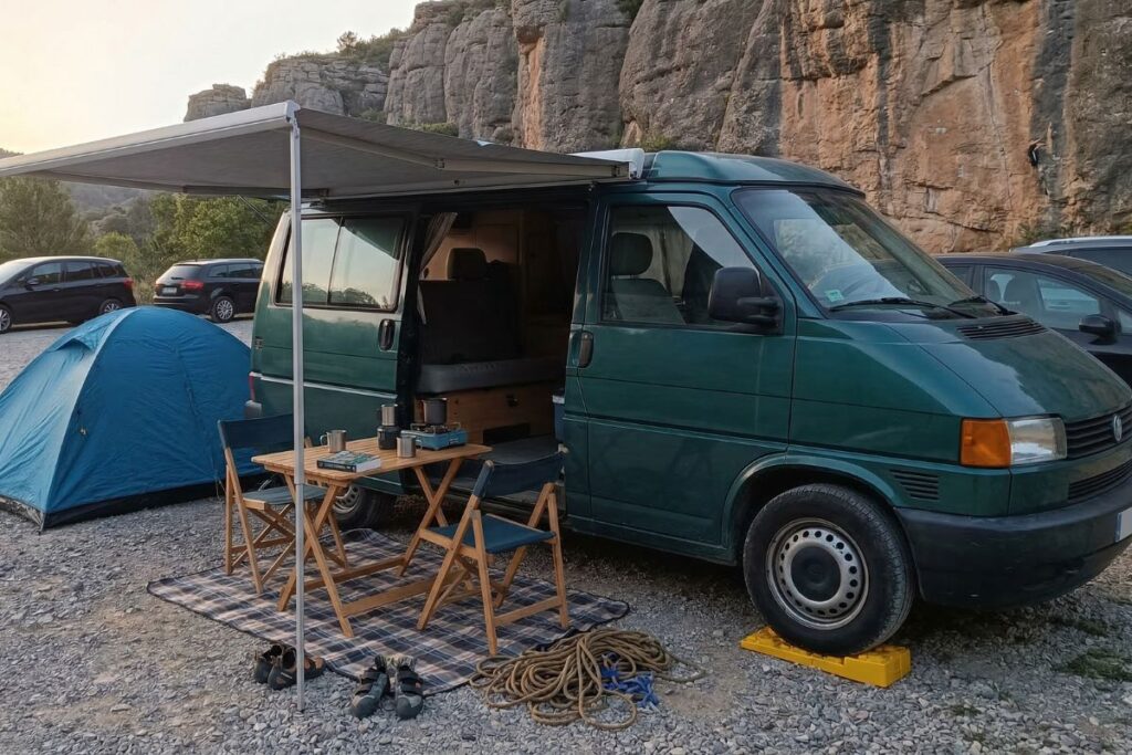 Cualquier objeto que coloques fuera de la furgoneta se considera acampada. Esto incluye el mobiliario básico (mesas, sillas, hamacas), pero también elementos técnicos como tendederos, calzos de nivelación o patas estabilizadoras. Incluso el simple hecho de dejar un par de zapatillas de escalada o una garrafa de agua en el suelo bajo el chasis puede ser interpretado como un uso privativo del espacio público.